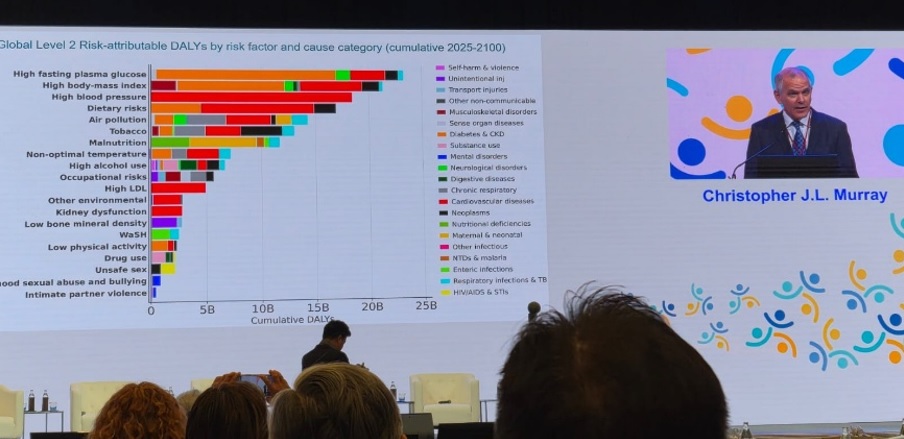Keynote speaker Chris Murray (Director IHME) menunjukkan modelling dengan data demografi dunia yang menunjukkan bagaimana mayoritas negara-negara di dunia akan mengalami penurunan tingkat penduduk dalam decade-dekade mendatang, namun pertumbuhan ekonomi yg buruk akan memperdalam jurang antara kelompok yang kaya dengan yang rentan. Selain itu, mayoritas penyakit-penyakit tidak menular akan mendominasi, dan bagian terbesarnya adalah penambahan despressive disorder, dan teridentifikasi pula sekitar 500 faktor risiko.  Dari 500 faktor risiko tersebut, analisis dilakukan hingga terideintifikasi 17 ancaman utama dan apa ancaman tertingginya. Dari ancaman-ancaman utama terhadap Kesehatan tersebut, terdapat 5 ancaman di posisi teratas yang dapat diubah secara perilaku dan pendekatan system, yaitu obesitas (metabolic driver), Pendidikan rendah (social economy determinant), ketidaksetaraan ekonomi (social determinant), tembakau dan unhealthy aging.
