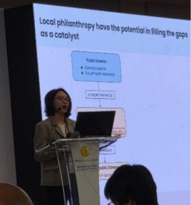 Sesi ini juga menampilkan Ghina Fadhilla (Indonesia) yang menyampaikan bagaimana beberapa pendanaan (termasuk filantropi) digunakan untuk membiayai Kesehatan di Indonesia, misalnya melalui Dompet Dhuafa dan lain-lain, yang membantu pemerintah dalam pendanaan untuk penanggulangan bencara, layanan berbasis komunitas dan lain-lain. Namun tantangannya adalah pendanaan ini biasanya bersifat ad-hoc, tidak selalu terintegrasi dan tidak berkelanjutan.